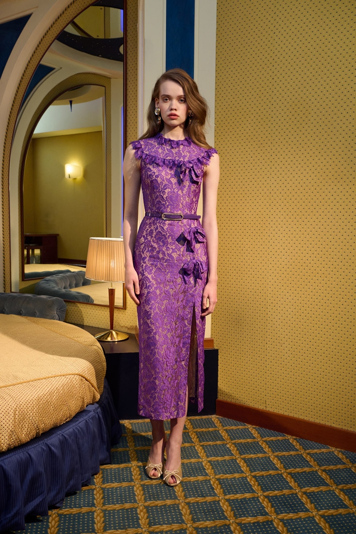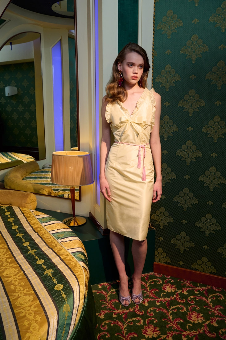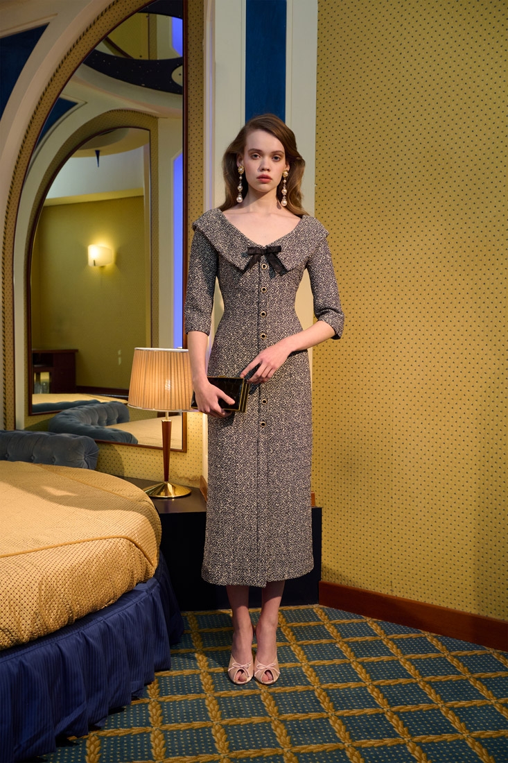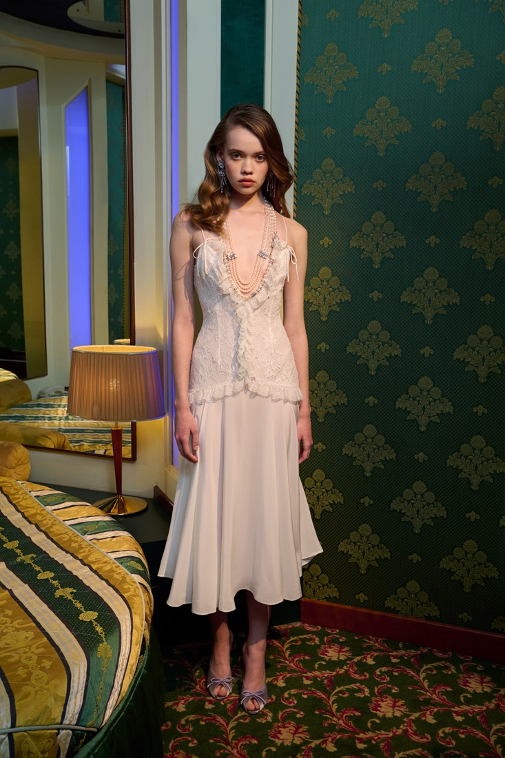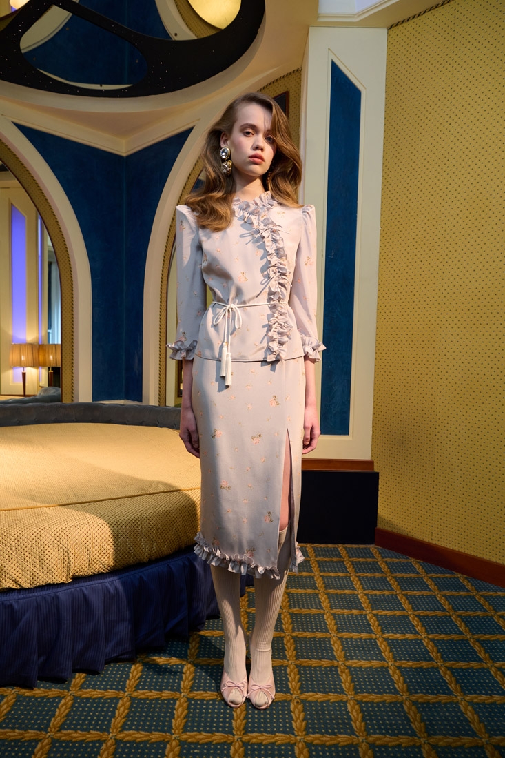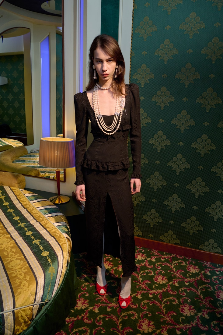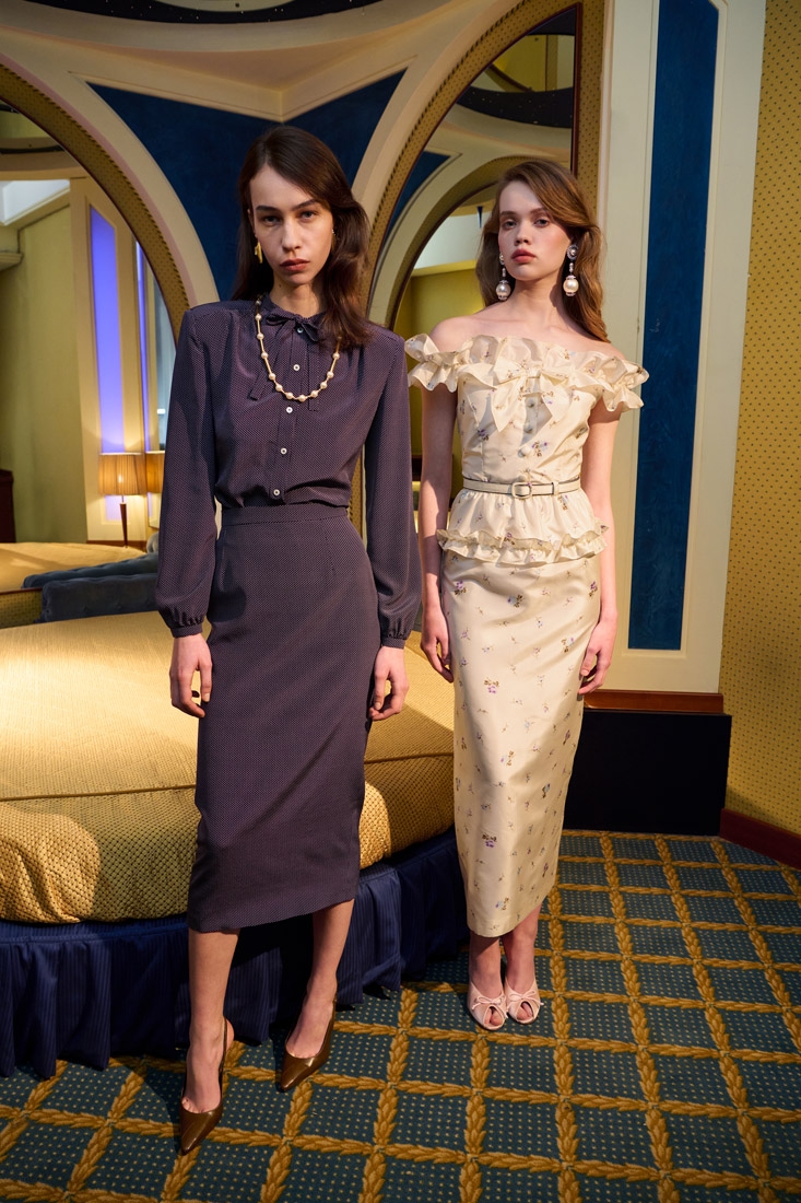 Made entirely in Italy, the collections are distinguished by refined fabrics such as silk crepe de chine, wool tweed bouclé and Chantilly lace. Romantic details such as lace trimmed collars, puff sleeves, and feminine silhouettes are offset with an ironic edge, resulting in designs that are both elegant and unexpected.