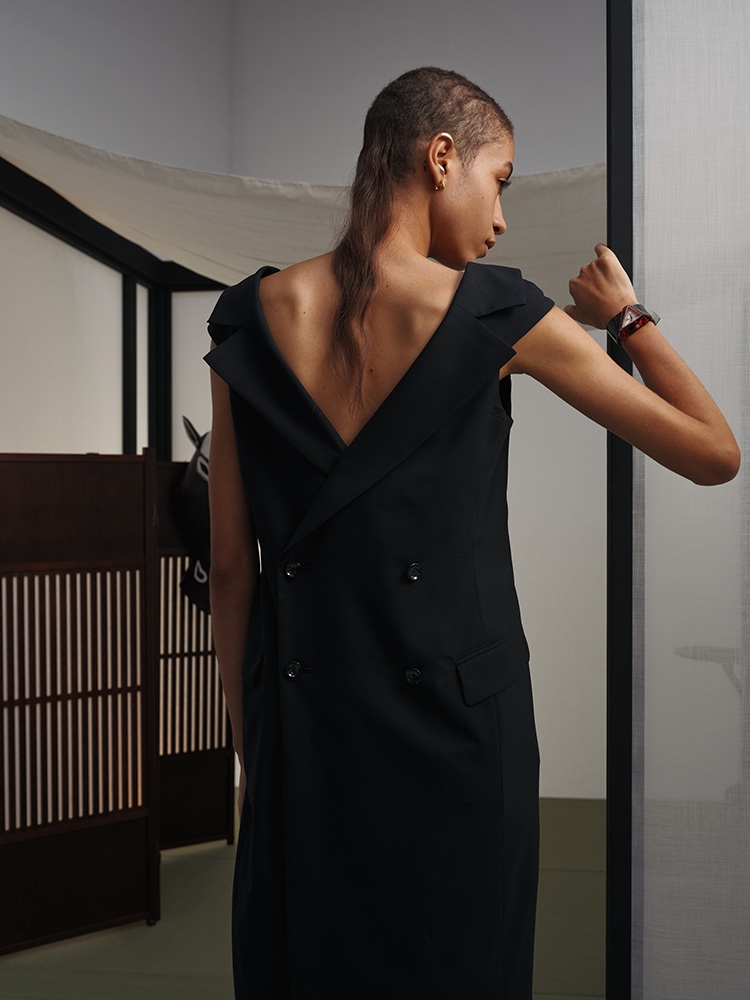 Yamaguchi’s design philosophy—“The past stands before the future”— draws from Mies van der Rohe’s concept of Universal Space, resulting in genderless, modern silhouettes meant to be reused across generations. His upbringing in a Japanese ghetto and exposure to underground culture inform his defiant approach to social injustice, often expressed through the modernization of vintage garments with bold, architectural forms.
