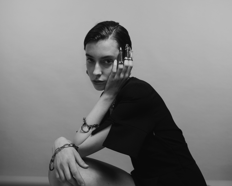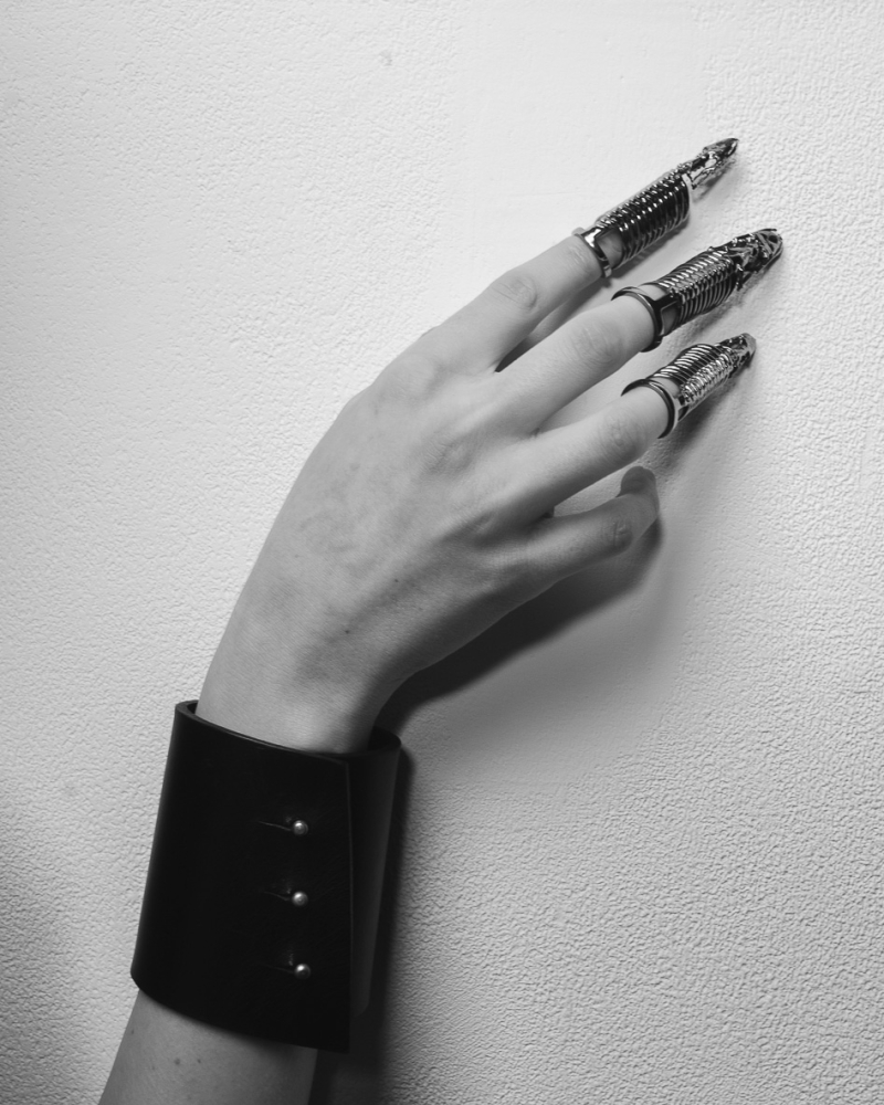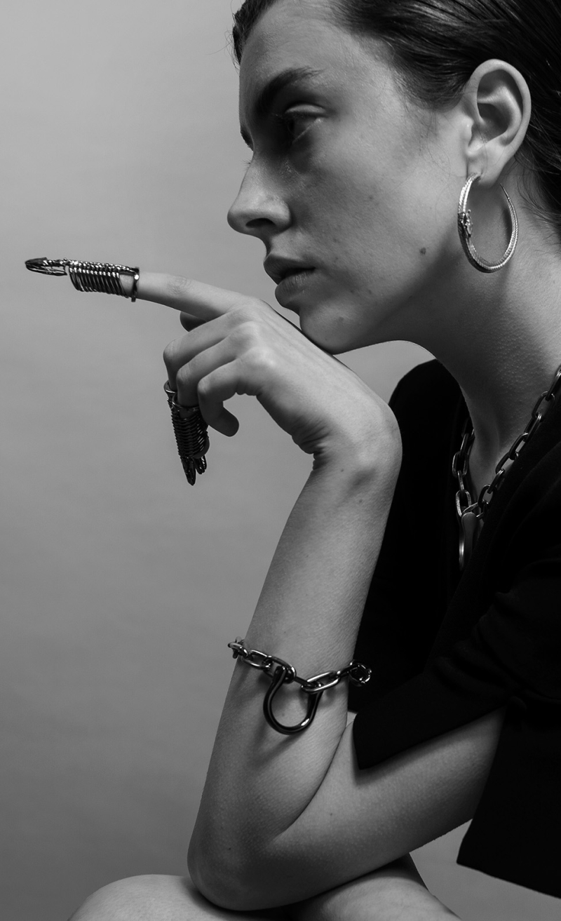 B_Dodi futuristic yet refined aesthetic is developed with sleek stainless steel face-jewels, black rhodium and sterling silver snake nail rings, hoops, necklaces, and black metal jewelry. Shapes are geometric, bold, and sharp.
