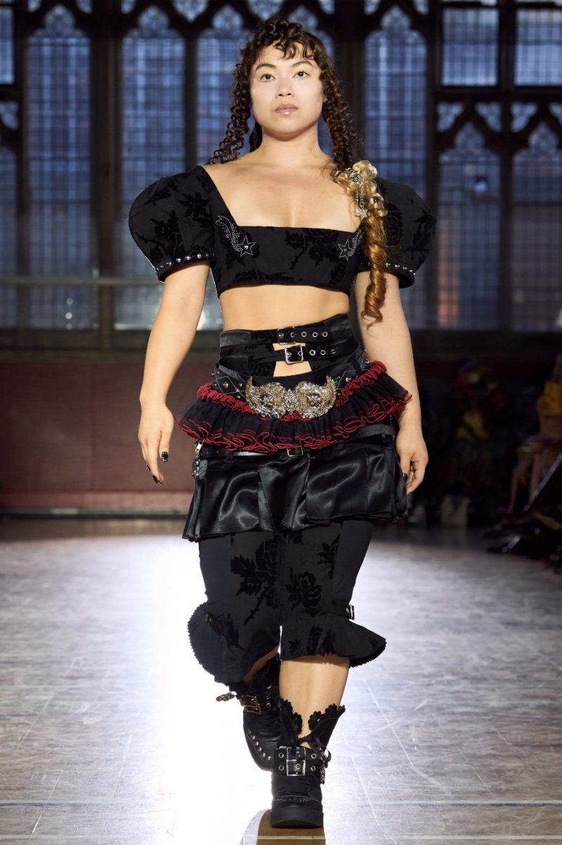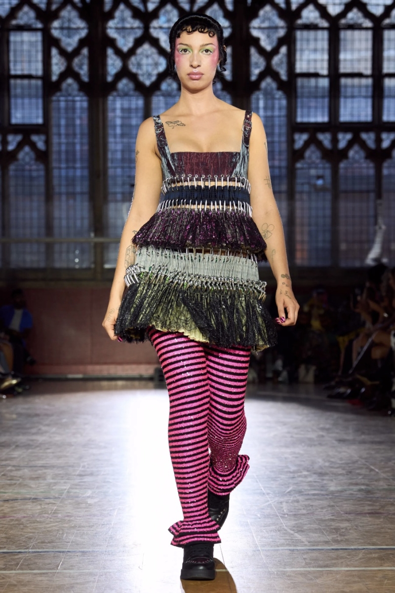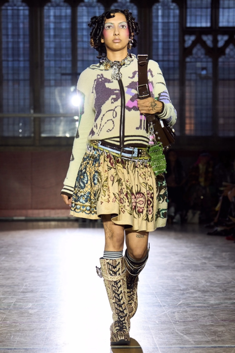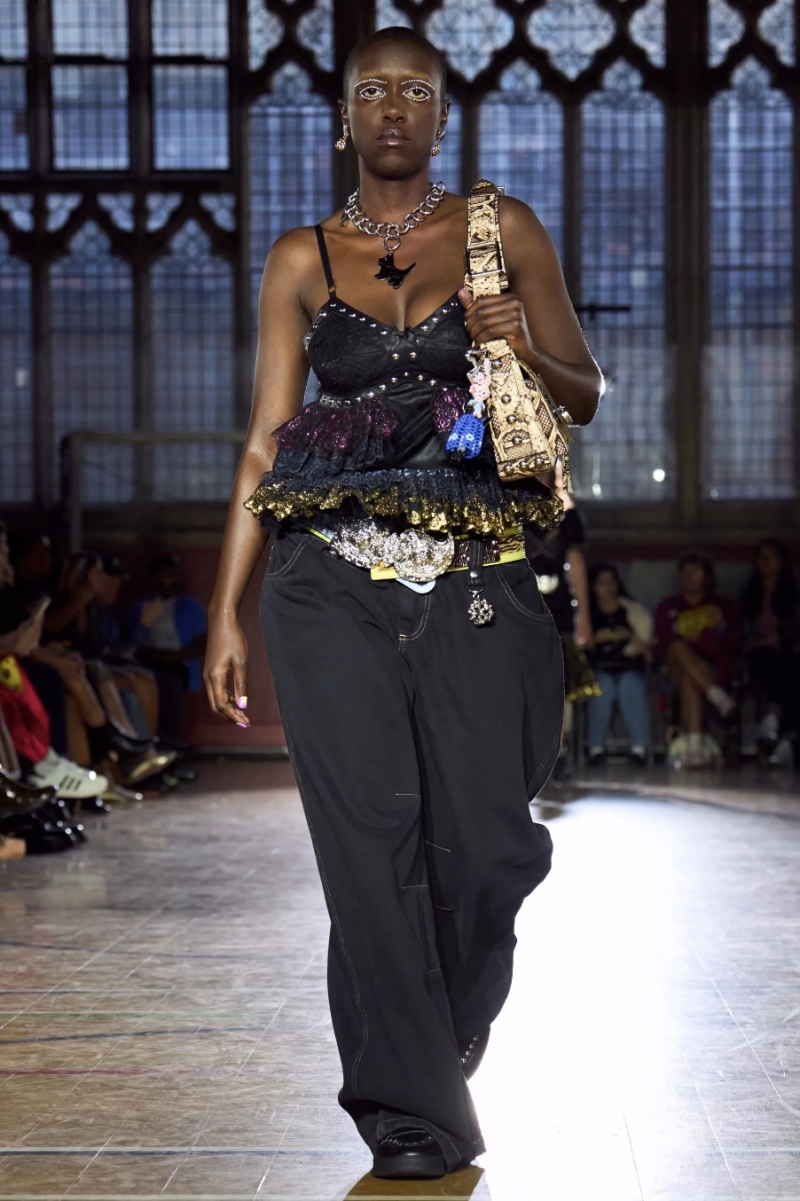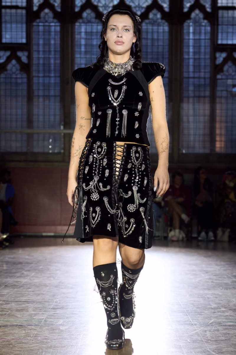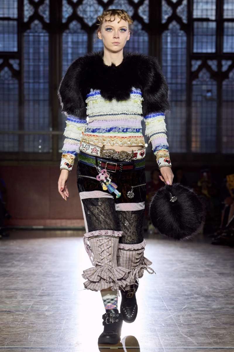 Chopova Lowena juxtaposes folklore and sportswear with a focus on sustainability and craft. Their anthropological approach to design is defined by the appreciation and modernisation of traditional textiles, crafts, and techniques. Utilising nuanced intersections between worlds and themes, they seamlessly marry references ranging from Bulgarian folklore to 1980s rock climbing. They strive to honour these seemingly incongruous references by creating harmonious and distinct pieces. Whilst achieving their aesthetic vision, they prioritise sustainability and ethical practice by using recycled materials and deadstock textiles, often in the form of pillowcases and aprons. This ethos extends to their employment of skilled female artisans in Bulgaria; through cultivating a community of seamstresses, they create stable job opportunities for women passionate about rejuvenating cultural heritage through the preservation of traditional techniques. The objective of their brand is to champion a system of ethical consumption, by upholding an appreciation of skill, craft, time, and environmental impact.