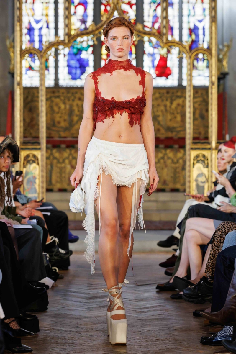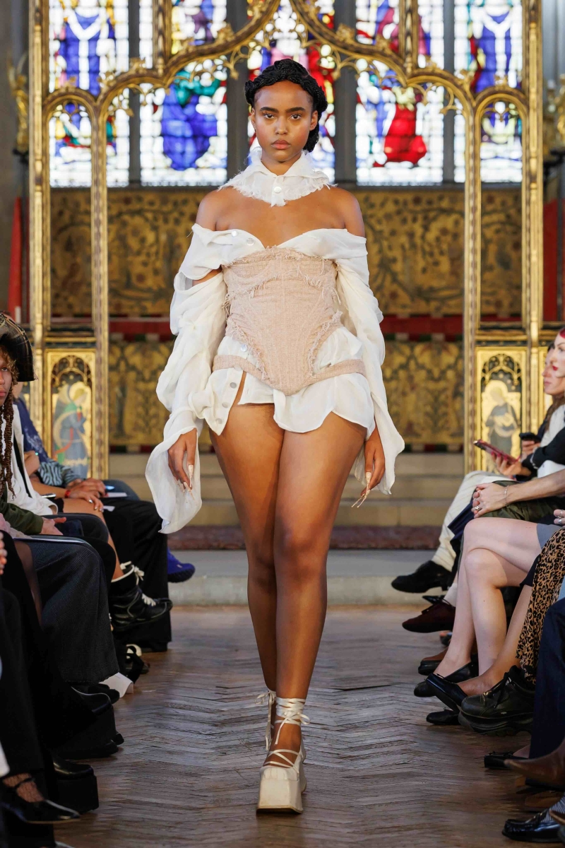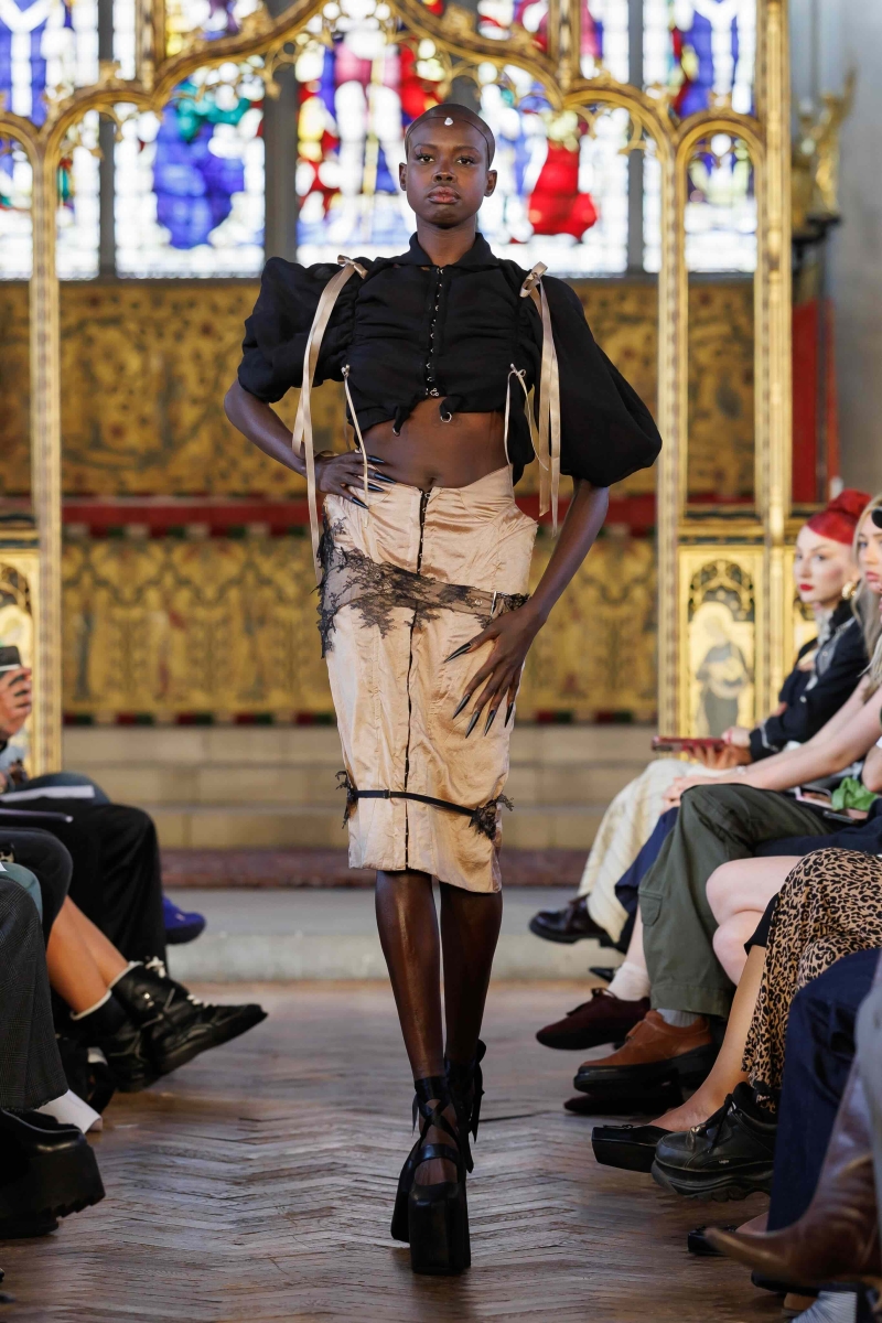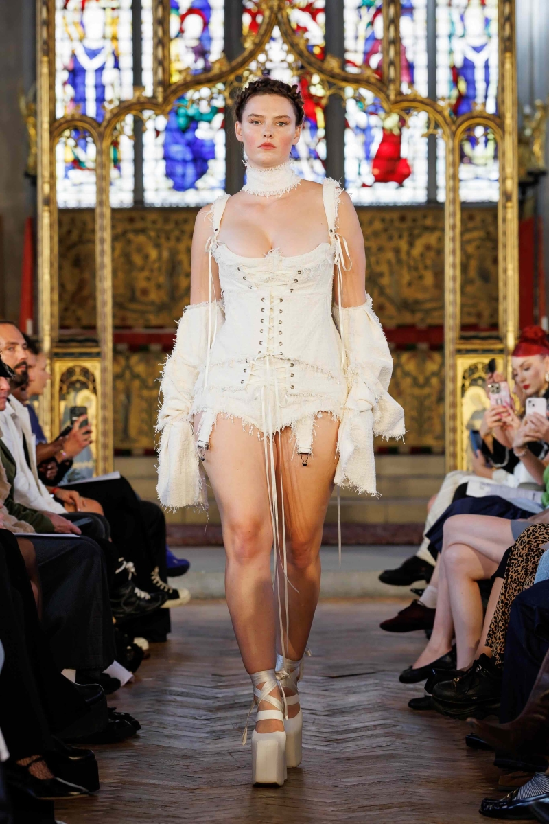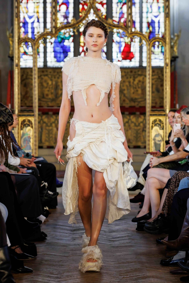 Dreaming Eli’s lingerie-coded, couture-inflected collections are made entirely in London, using hand-dyeing, hand-distressing, pleating and patchworking to ensure each piece is unique. Romantic draping, dramatic volume and structured corsetry blend with underwear-inspired eveningwear, layered with silks, Chantilly lace, tulle, chiffon and satin, balancing fragility with power. Lace-up adjustability ensures a fit for real bodies and longevity through design.