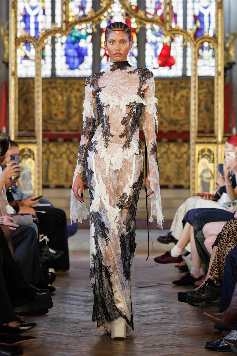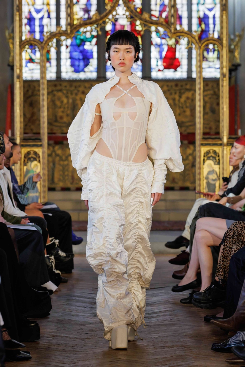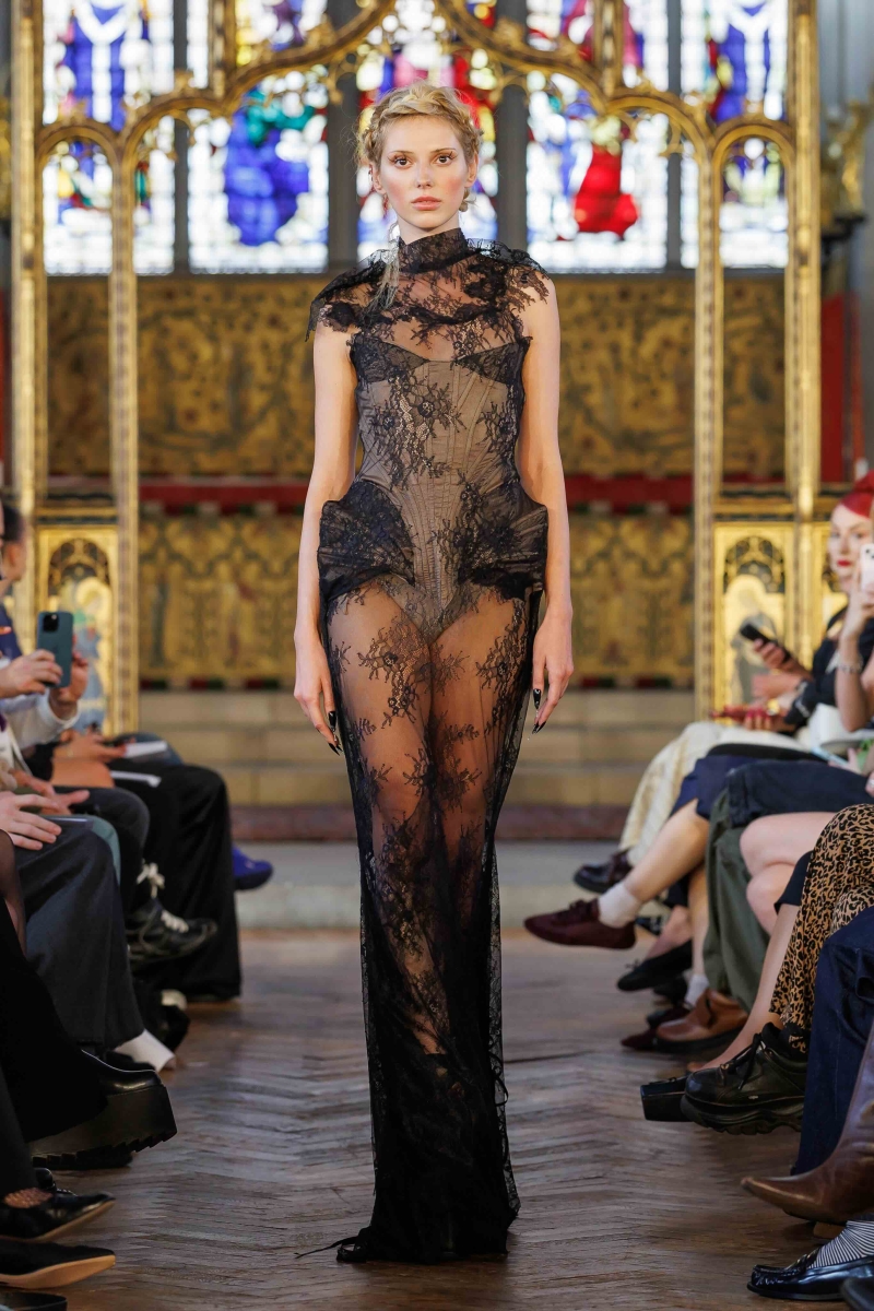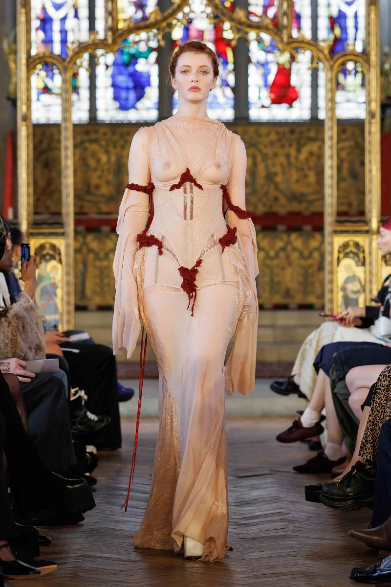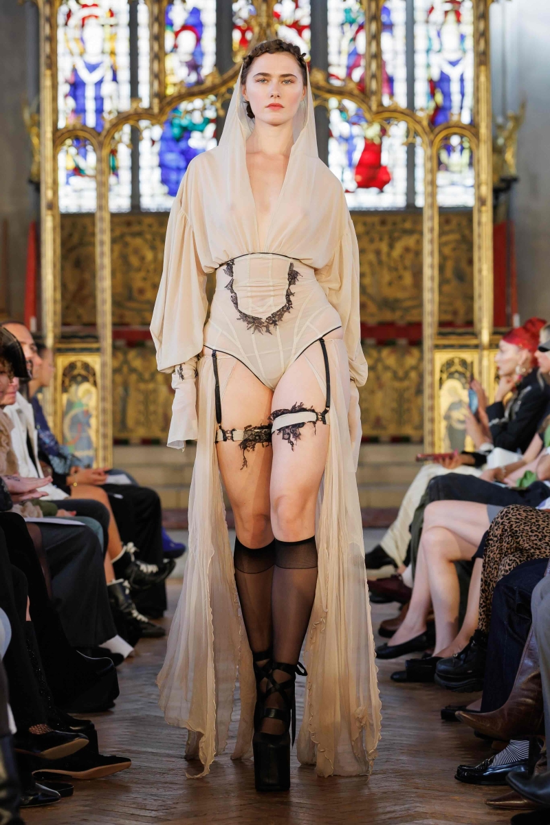 Dreaming Eli’s lingerie-coded, couture-inflected collections are made entirely in London, using hand-dyeing, hand-distressing, pleating and patchworking to ensure each piece is unique. Romantic draping, dramatic volume and structured corsetry blend with underwear-inspired eveningwear, layered with silks, Chantilly lace, tulle, chiffon and satin, balancing fragility with power. Lace-up adjustability ensures a fit for real bodies and longevity through design.