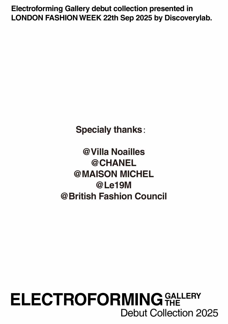 Electroforming Gallery, established by Chiyang Duan in London in 2025, is an art space that exhibits fashion and accessories. The space was founded by curator duo Chiyang Duan and Yihan Huang, who are both graduates of the Royal College of Art. Each season, the gallery presents a different theme of fashion objects and products, showcasing diverse artistic direction curated by the duo of curator & designer.