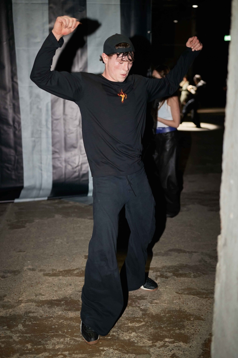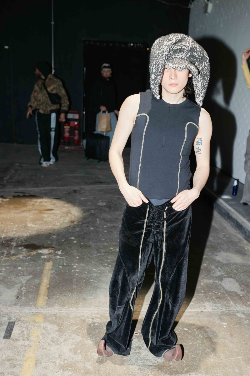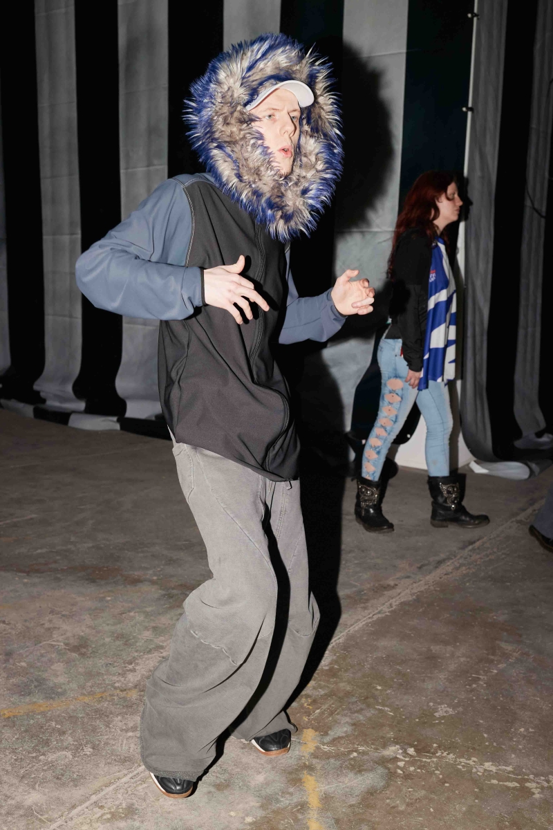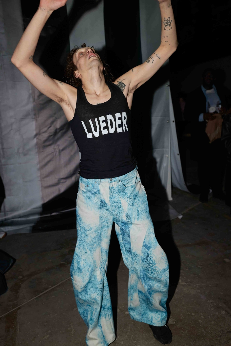 past and the future marry into a contemporary vision. The runway experience will be immersive, featuring custom carpets sponsored by Pointex, adorned with black-and-white images of LUEDER’s community—part mugshots, part spectral apparitions. Three grand chandeliers, designed by Tym Novikov, will hang above, refracting laser light and echoing the collection’s motto: an upside-down rose motif symbolizing a distorted, illusive reality. Sound design by Simon Parris will incorporate a heartbeat-like ticking clock, the hum of drones, and a haunting, androgynous acapella voice, reinforcing the show’s surreal and cinematic ambiance.
