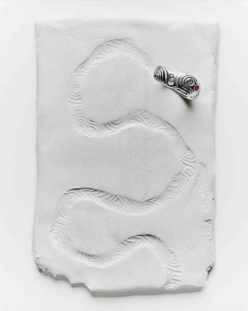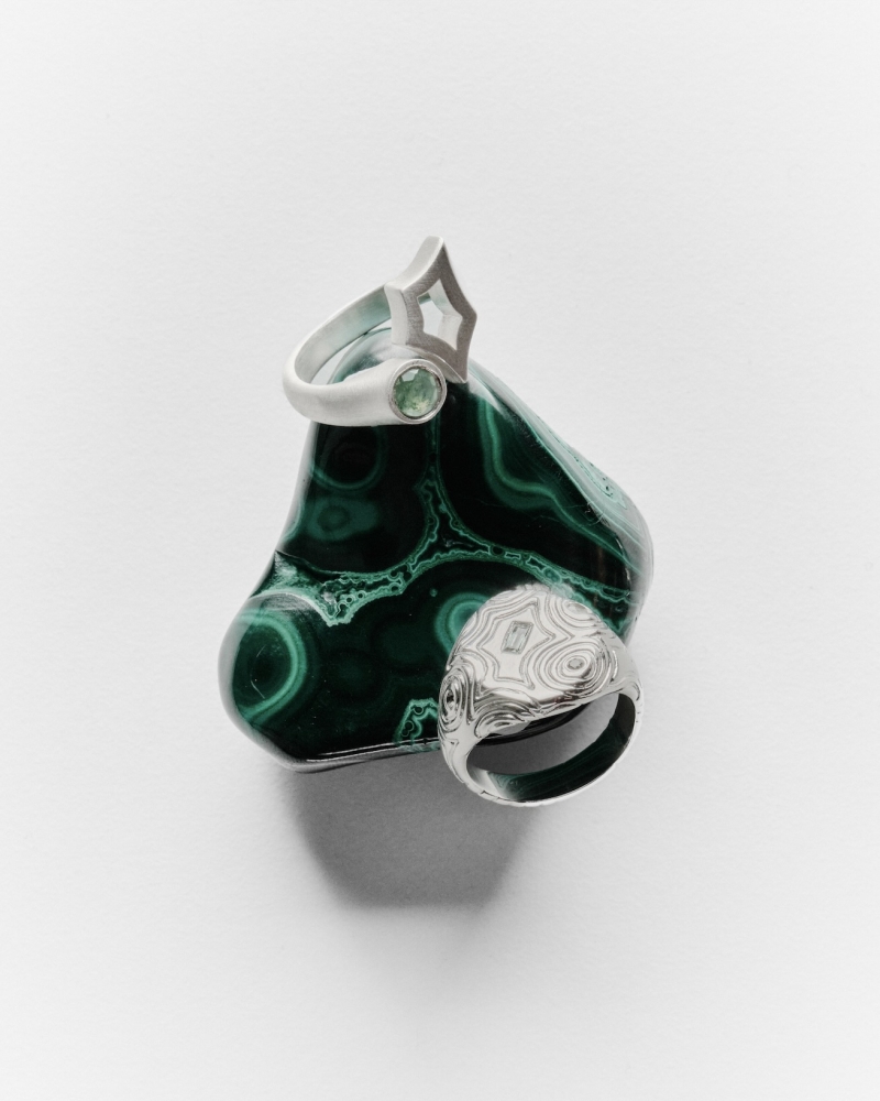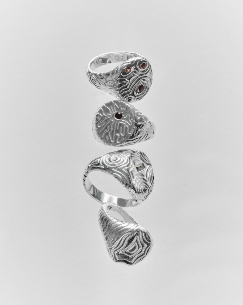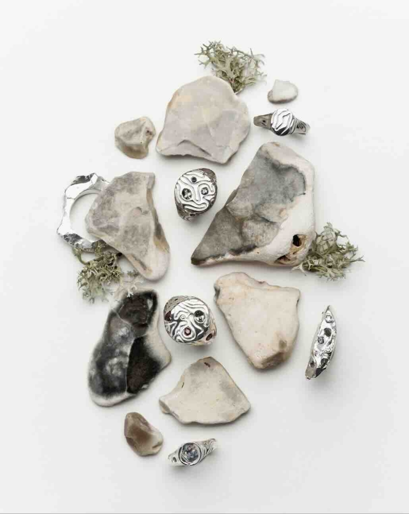The process can involve creating moulds of natural forms such as rocks, then sculpting these into wearable forms. Other designs emerge from melted wax, finished with delicate hand-drawn line work.