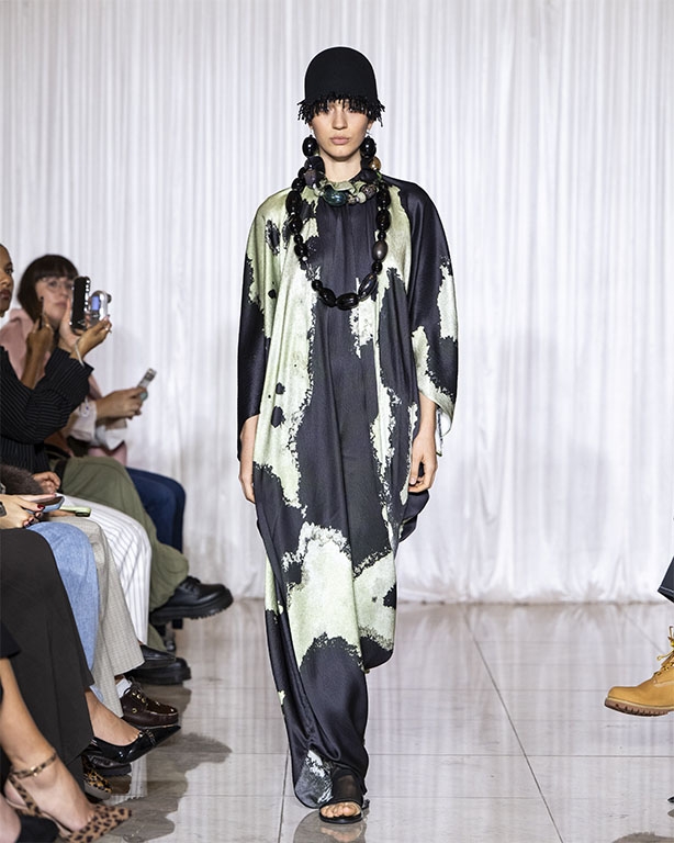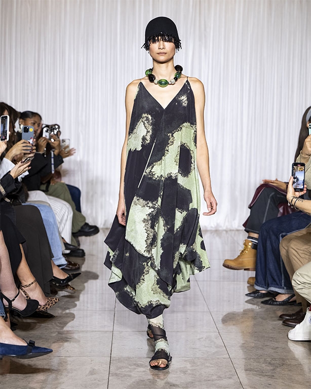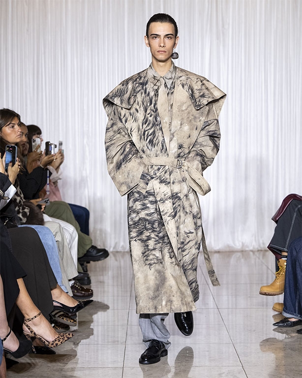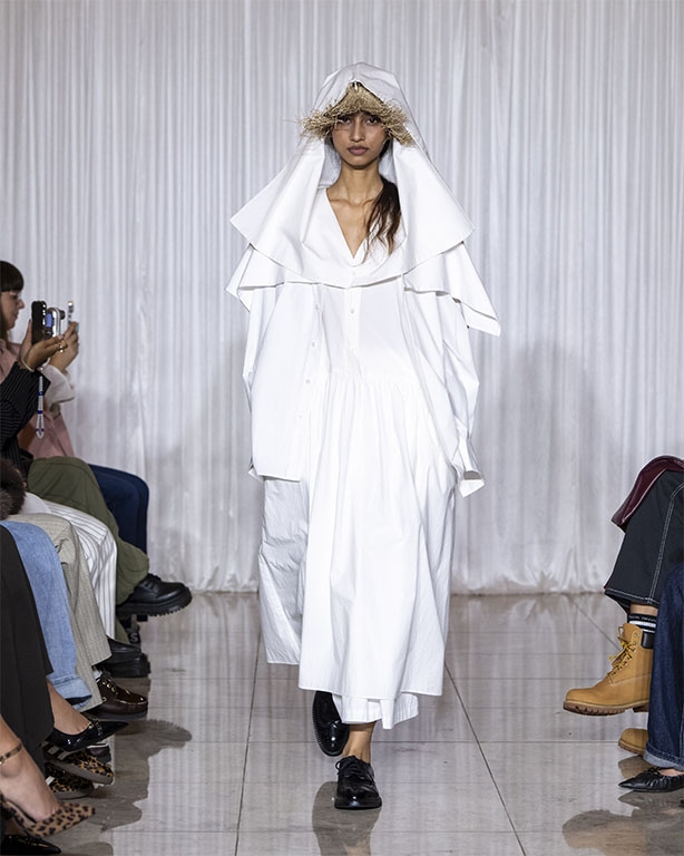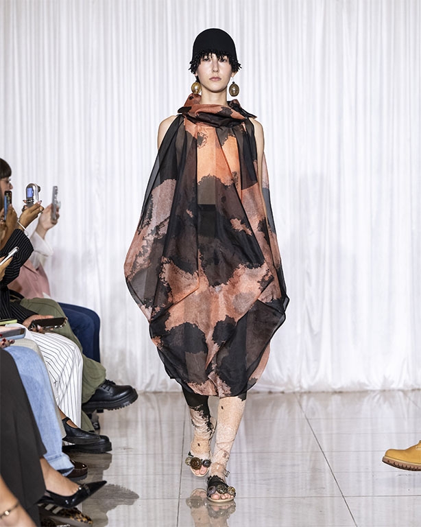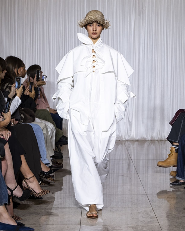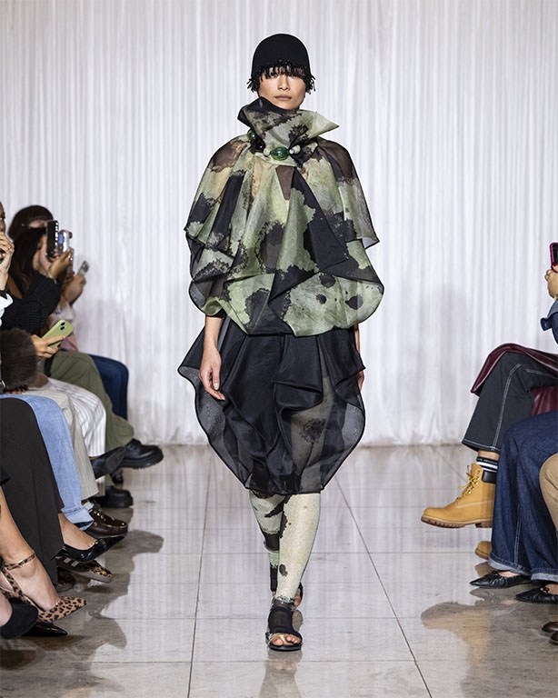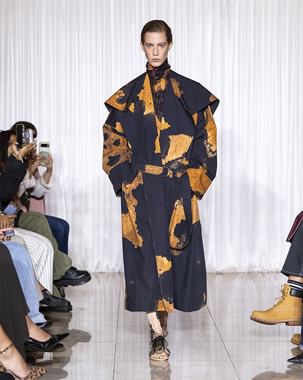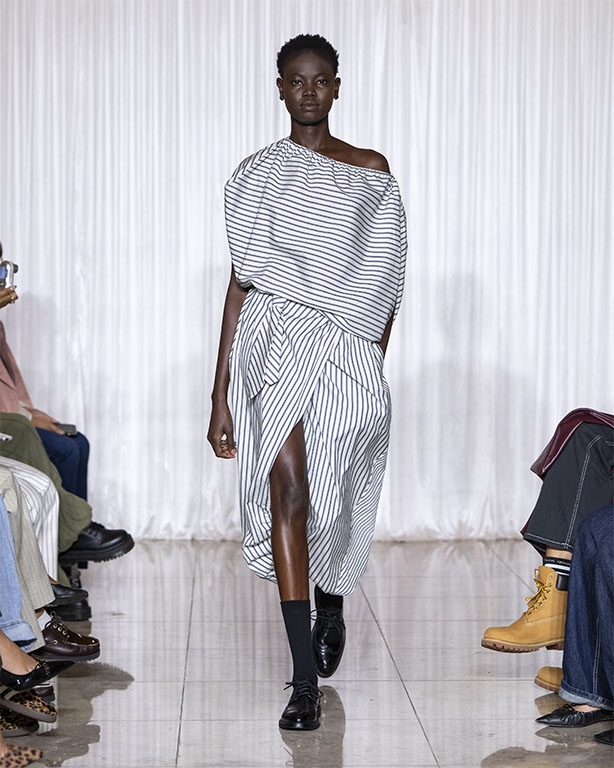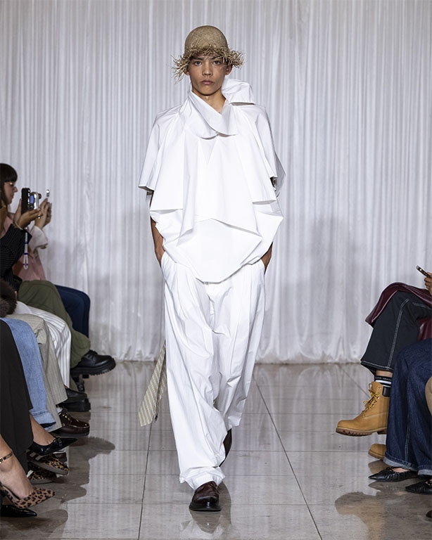 Focused on the creative process, drawings that evolve into paper maquettes are enlarged and draped into fluid and sculptural shapes, 3D forms interplay with 2 dimensional depictions, blurring the lines of depth and perception. The conceptual is refined into garments that feel reassuringly familiar yet aspirational.
