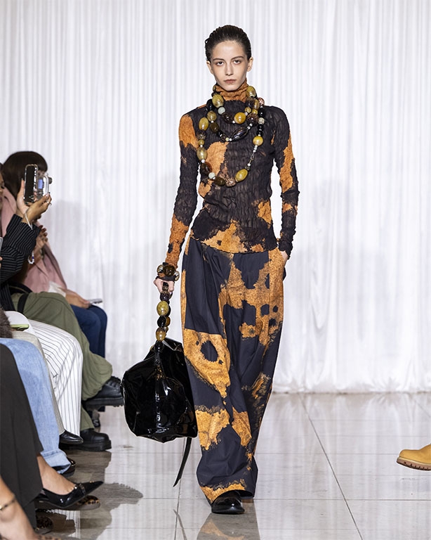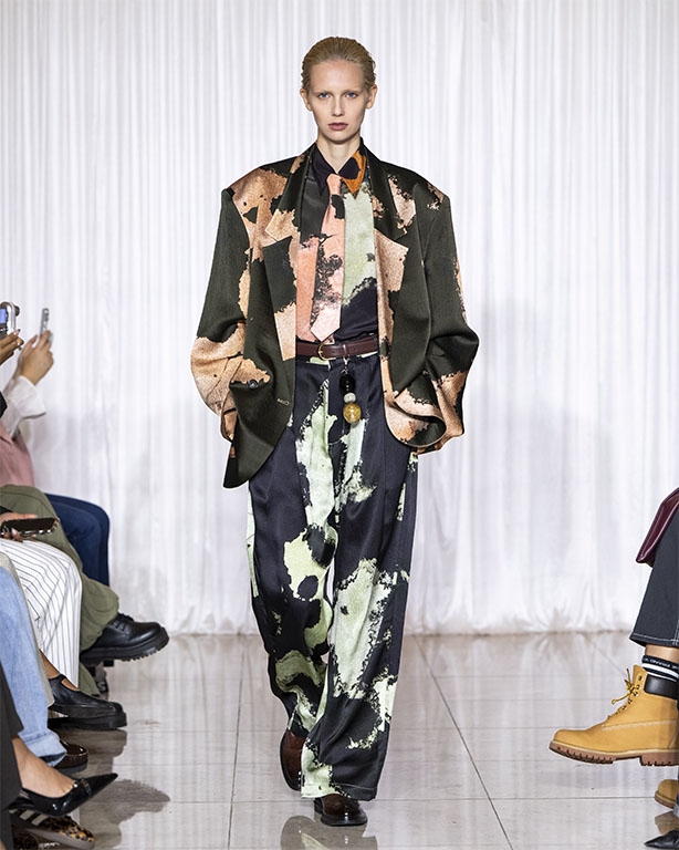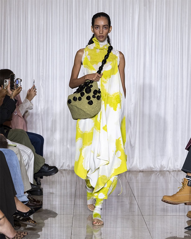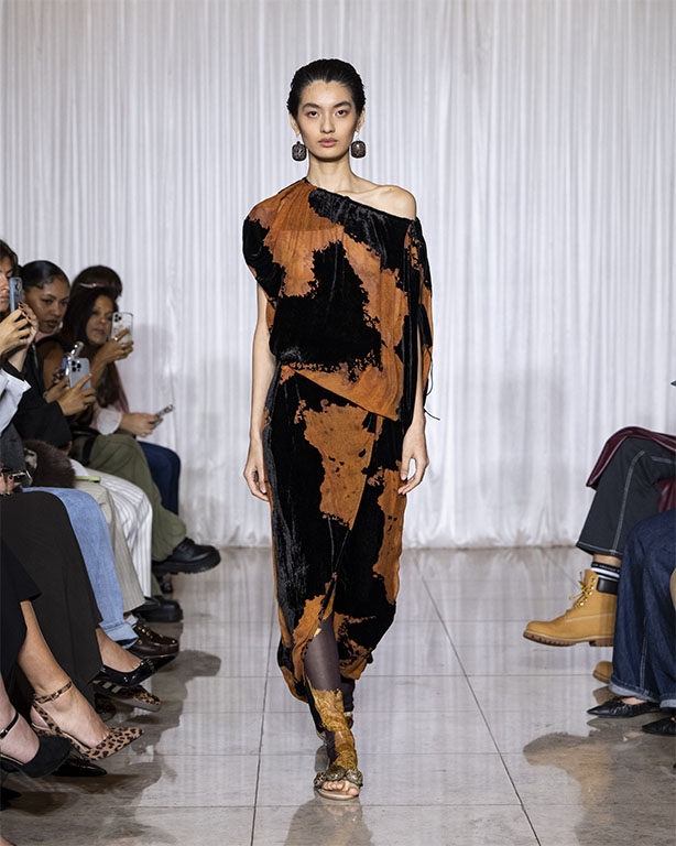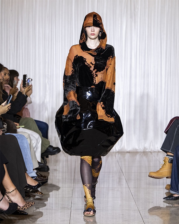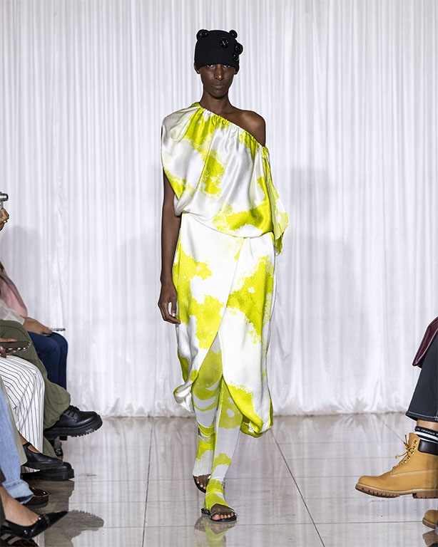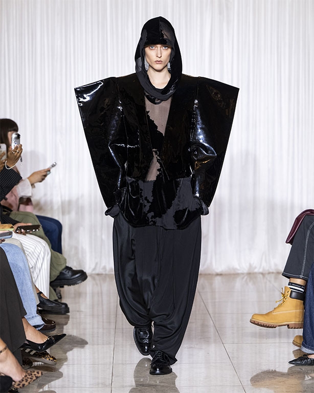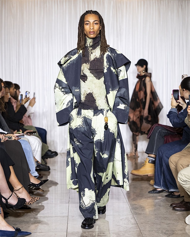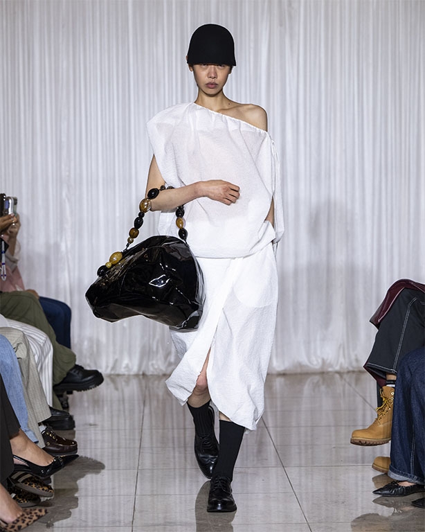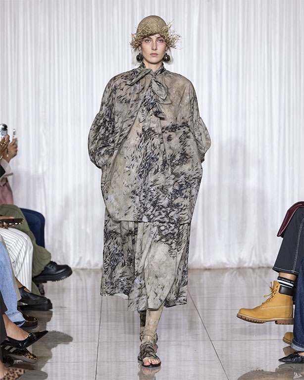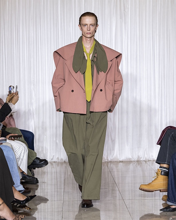 Focused on the creative process, drawings that evolve into paper maquettes are enlarged and draped into fluid and sculptural shapes, 3D forms interplay with 2 dimensional depictions, blurring the lines of depth and perception. The conceptual is refined into garments that feel reassuringly familiar yet aspirational.