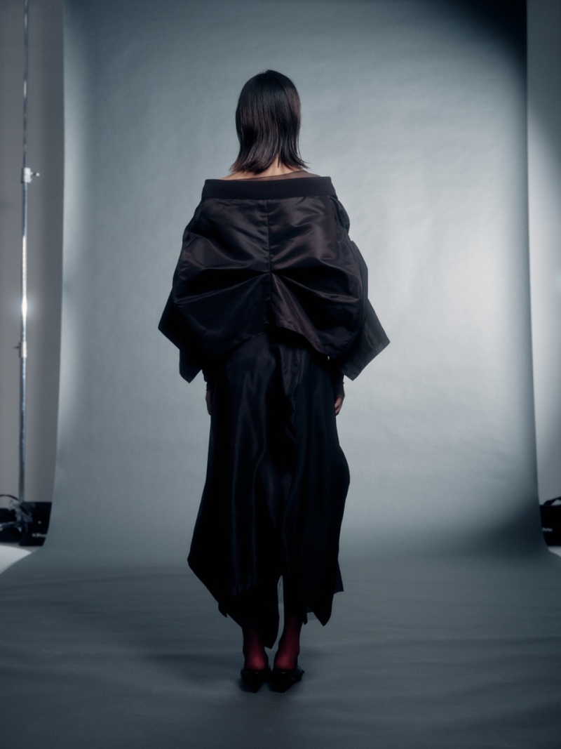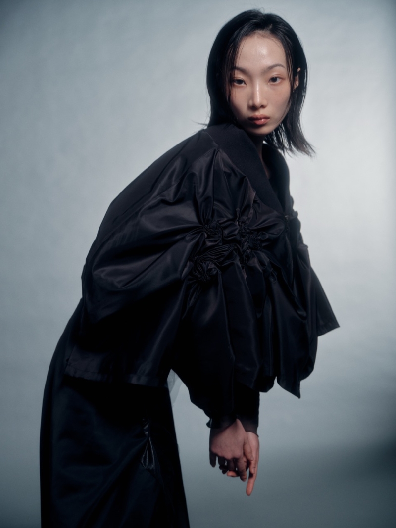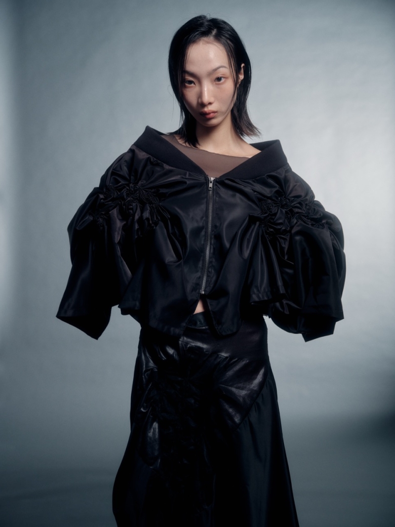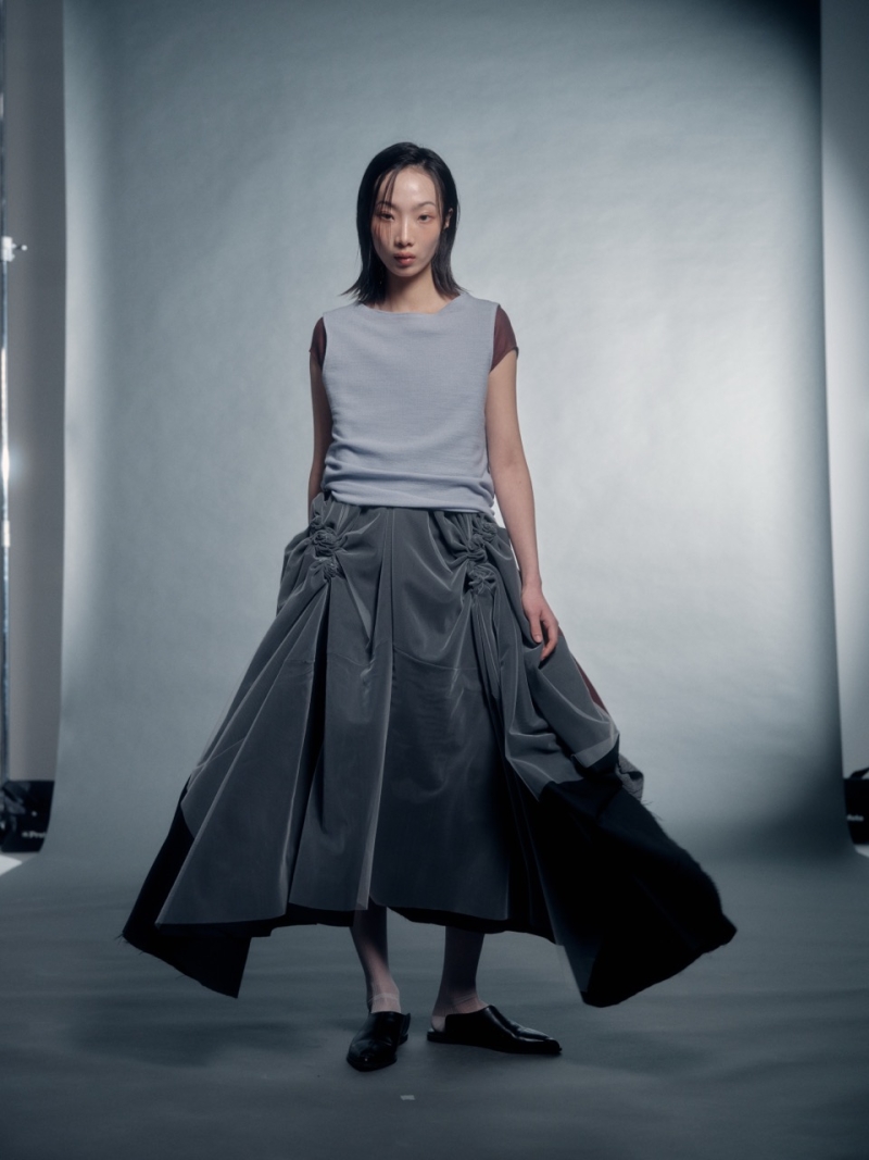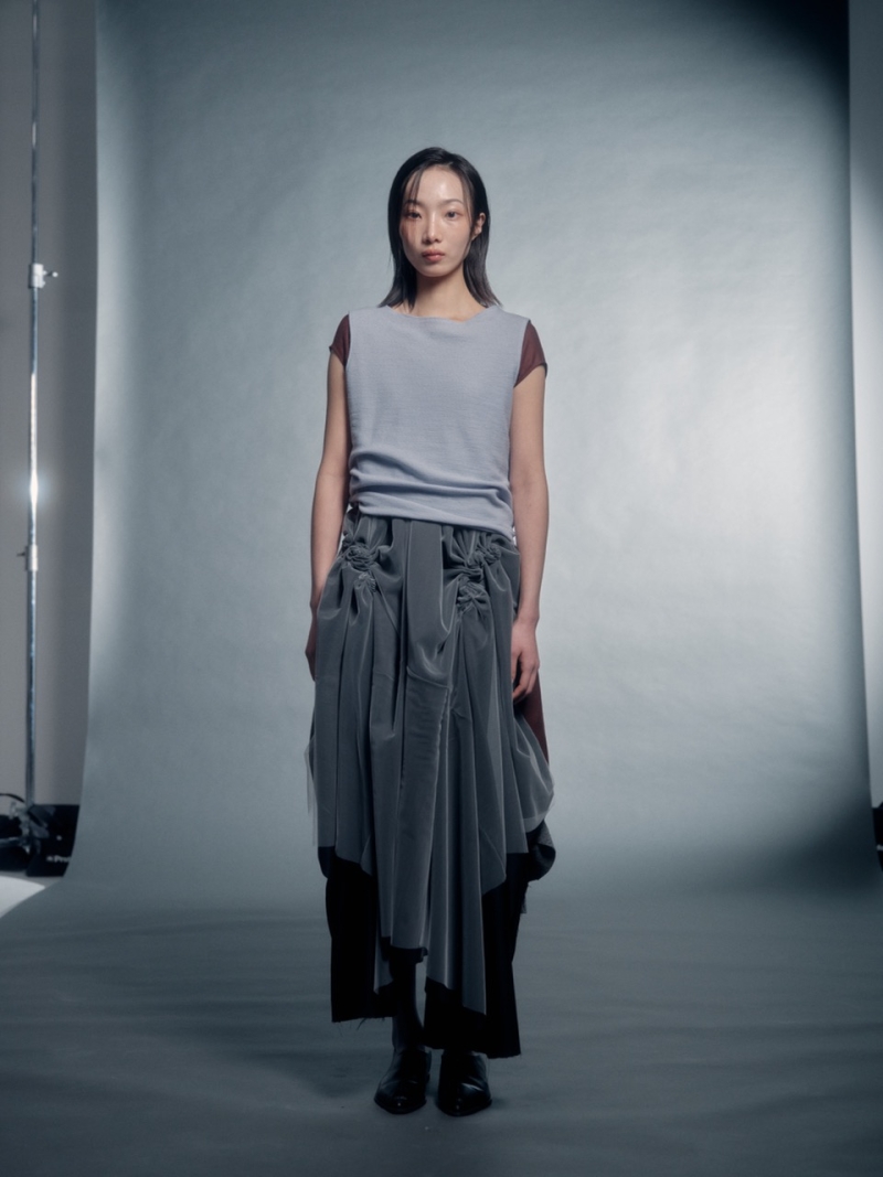 Her work explores the tension between rigid structure and delicate surface, often merging menswear-rooted construction with refined, unexpected details. Rather than presenting gender as a binary, Yonzu references it indirectly—through proportion, weight, texture, and the interplay of opposing sensibilities. This approach has defined YONZU’s evolving aesthetic, positioning the brand as a visual study of duality and restraint.