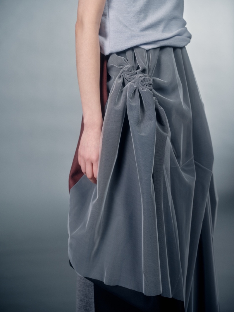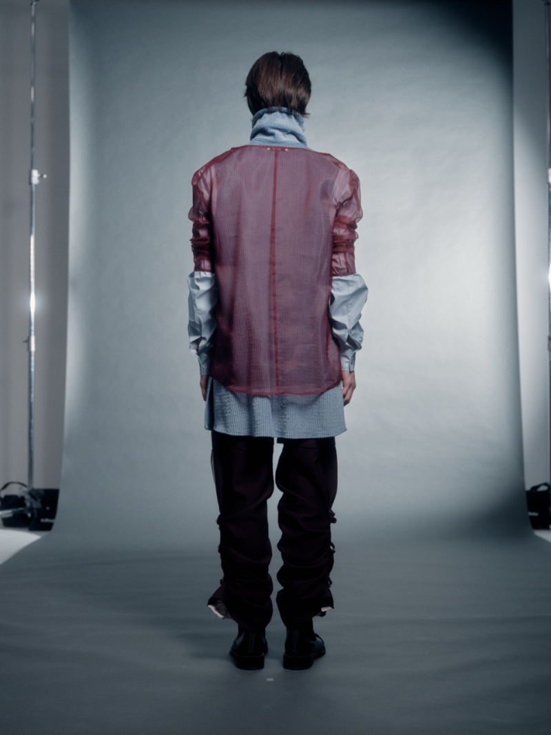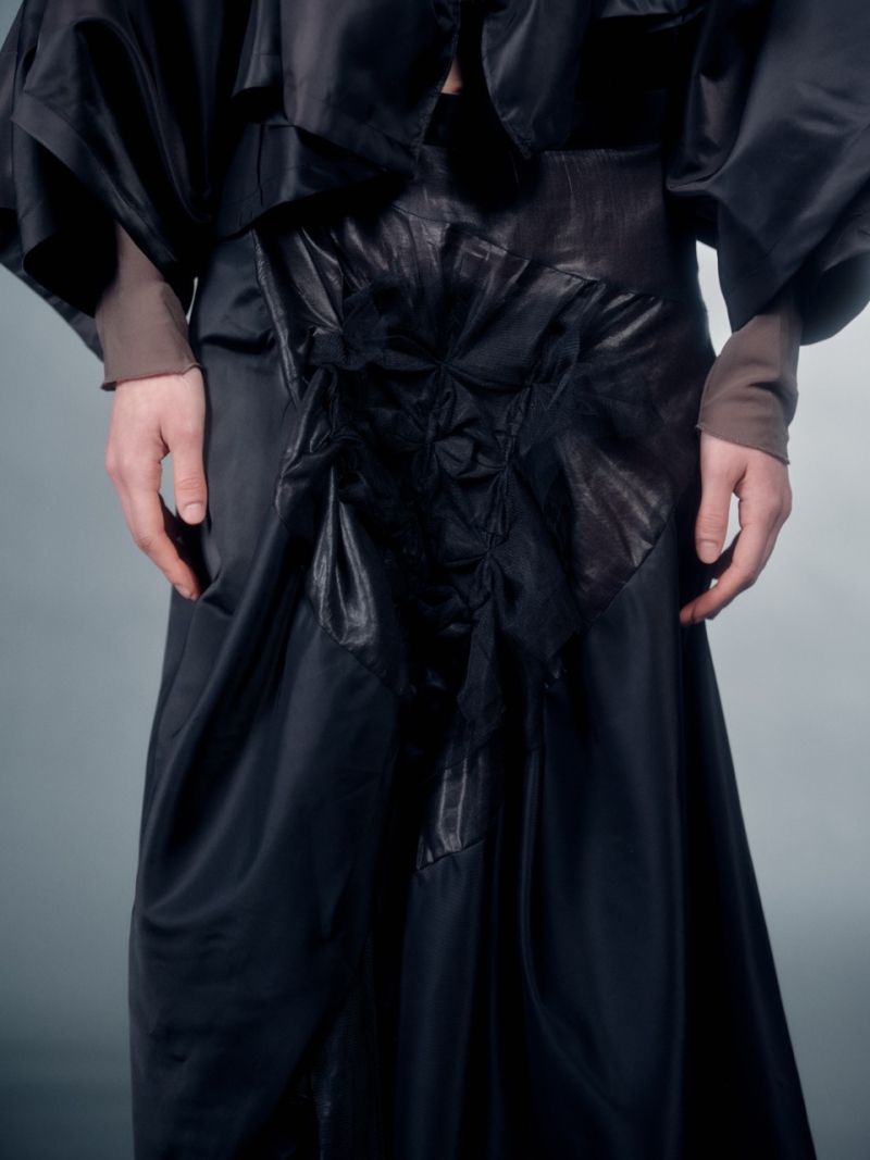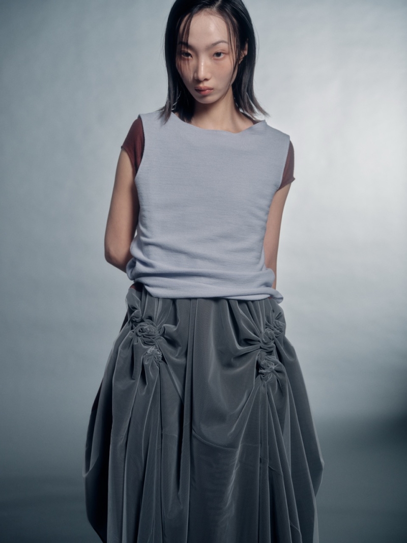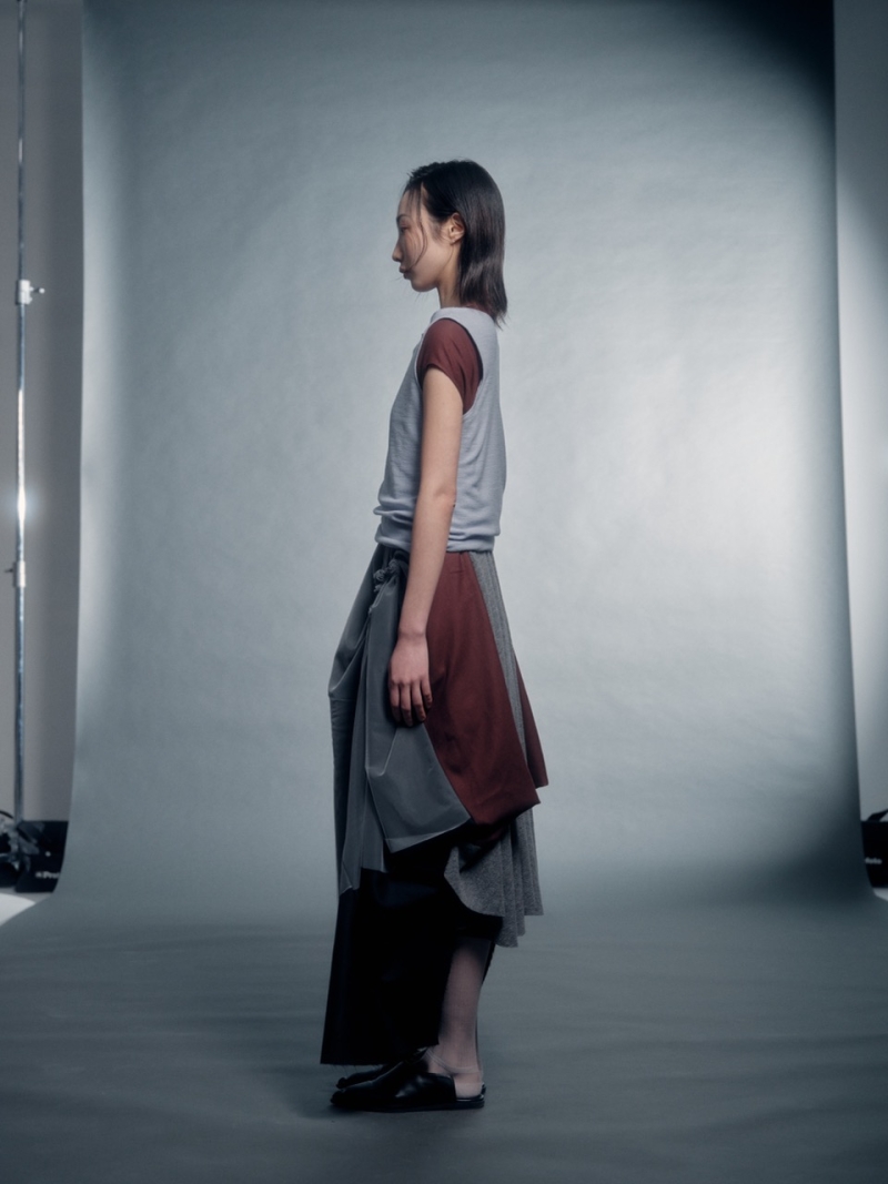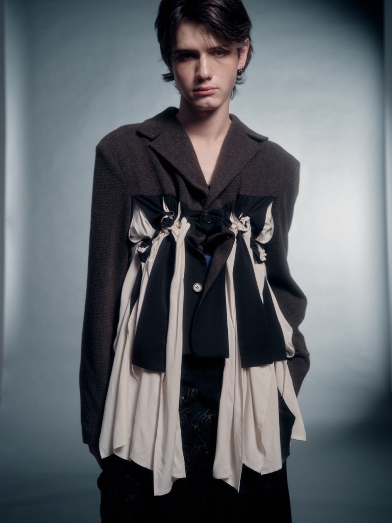 Her work explores the tension between rigid structure and delicate surface, often merging menswear-rooted construction with refined, unexpected details. Rather than presenting gender as a binary, Yonzu references it indirectly—through proportion, weight, texture, and the interplay of opposing sensibilities. This approach has defined YONZU’s evolving aesthetic, positioning the brand as a visual study of duality and restraint.